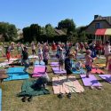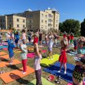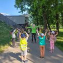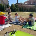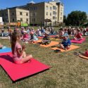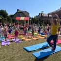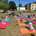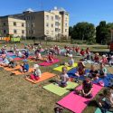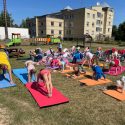 Saulėtą penktadienį Petro Avižonio ugdymo kiemelyje vyko rytinė vaikų mankšta „Joga kartu“.