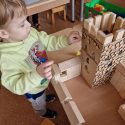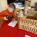 Apžiūrėję, kokių antrinių žaliavų turi daugiausiai, nusprendė, kad panaudos butelių kamščius – sienoms, o kiek jų sunaudojome, tikrai daug. Tuomet dar balkonui ir arkoms naudojome turimas medines kaladėles, o kolonoms – popierinių rankšluosčių ritinėliai puikiai pavyko išgauti norimą vaizdą.