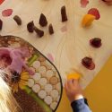 Daug daržovių savaitės veiklai atsinešė vaikai. Buvo nepažįstamų, įvairių formų, didelių ir mažų. Vaikai kiekvienas išvardijo ką atsinešė. O auklėtoja atsinešė dažančių daržovių. Pabandėme jomis štampuoti ant lapo ir nudažyti audinį. Kai kas labai pradžiugino vaikus, o kai kas ir nepavyko.