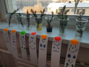 Vaikai pamerkė eglės šakeles į kelis indelius su įvairiais tirpalais: vandenį, actą, vandenį su dažais, kavą, vandenį su cukrumi, vandenį su druska ir vieną šakelę padėjo sausai. Susitarė stebėti 10 dienų ir savo stebėjimus žymėti sutartiniu ženklu: linksmu, rimtu, liūdnu veideliu. Eksperimentui pasibaigus aptarė išvadą, koks skystis buvo tinkamiausias ir jame šakelė išliko ilgiausiai.