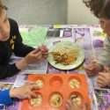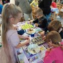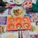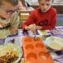 Kaip ir iš ko gaminamas muilas? Daug pamąstymų sukėlė…. Pirmiausiai mikrobangų krosnelėje buvo išlydyta muilo bazė. Išlydytą  bazę vaikai šaukšteliu pildė silikonines formeles. Pridėjo sudžiovinto moliūgo juostelių, jų sėklų, žievelių, dekoravo savo gaminius spalvingais karpiniais bei guminukais. Ir paliko 15 min. sustingti. Pagamintą masę išėmė iš formelių. Vaikai pasigamino gražių bei įdomios formos, nepakartojamų, vienetinių muiliukų, kuriuos galės išbandyti namuose.