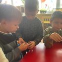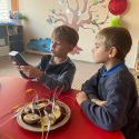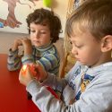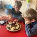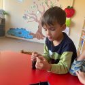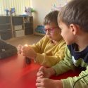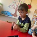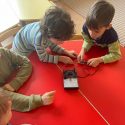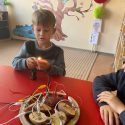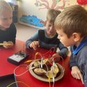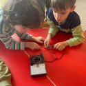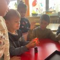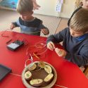 Vaikai apžiūrėję galvaninį elementą, pastebėjo du polius. Vienas pažymėtas minuso ženklu (-), kitas – pliuso (+). Pabandė prijungti lemputę ir nustebo, kai ji užsidegė. Išsiaiškinome, kodėl lemputė užsidega. Vėliau vaikams iškilo klausimas ar galima sustiprinti lemputės švytėjimą. Sujungėme kelis elementus nuosekliai ir grandinėje sustiprėjus elektros srovei, ir lemputės švytėjimas sustiprėjo. Vaikai buvo supažindinti ir su rodykliniu multimetru. Jo pagalba sužinojo, kad multimetro laidus palietus prie trijų nuosekliai sujungtų elementų baterijos polių, multimetro rodyklė atsilenks daugiau, nei prie vieno elemento polių.
