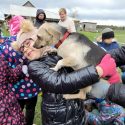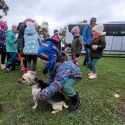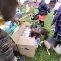 Ropštėmės iš autobuso ir darbuotojų padedami nešėme atvežtas lauktuvės kieman. Nespėjus visko sudėlioti, apspito mus būrelis mažų šunyčių, kurie aktyviai ropštėsi ant lauktuvių kalno ir puolė uostinėti ir net ragauti mūsų atvežtas vaišes. Smagu buvo visiems- ir mums, ir šuniukams. Pastarieji leidosi glostomi, apkabinami ir , žinoma, vaišinami. Vaikų emocijos liejosi per kraštus.