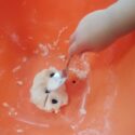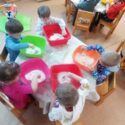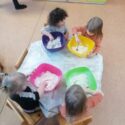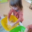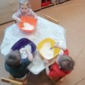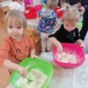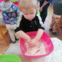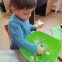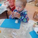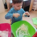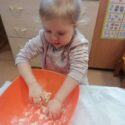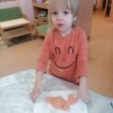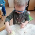 Kas yra plastilinas? ką galima su juo nuveikti? O ar kas gamino namuose? Taigi, plastilino gamyba grupėje. Mokydamiesi pažinti ir pavadinti baltą spalvą, vaikai dėjo įvairius ingridientus, iš pradžių „virdami baltą košę“, o po to – minkydami tešlą ir lipdydami savo kūrybos kūrinį. Patarimais naudojosi beveik visi ir lipdė ežiukus. Tiesa ežiukai, labai meniški gavosi. Paįvairinant veiklą, į tešlą varvinome maistinių dažų ir stebėjome, kaip jie įsilieja į tešlą.