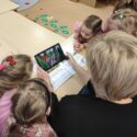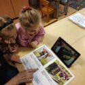Tęsiant temą apie knygeles, mokėmės naudotis planšete, žiūrėjome trumpus siužetus užkoduotus QR koduose E. Pšetulskienės knygelėje „Pasakos iš lagamino. Dramblio kelionė“.