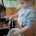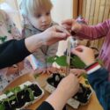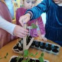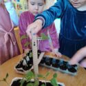 Pvasaris – spalvų ir pavasarinių darbų metas. Pasitarėme ir nusprendėme sėti pupeles, moliūgus ir svogūnėlius, o kur, ne į vazonėlius, o į kiaušinių dėklų dėžutes: popierinės, permatomo plastiko ir putplasčio.Vaikai savo mažomis rankytėmis bėrė žemę į dėklus. Mažieji sužinojo, kad augalams reikia drėgmės, tad pasodinę juos palaistė. Stebėdami, tyrinėdami jų dygimą ir augimą vaikai pastebėjo, kad augalai pasėti ir pasodinti vienu metu, sudygsta ir auga skirtingai, augdami linksta į šviesos pusę, nepalaistyti vysta. Praėjus 3 savaitėms vaikai pastebėjo, kad pupelės pasėtos popieriniame dėkle aukščiausiai išaugo pupelės, putplastyje paaugo moliūgėlių daigai, o vos ne vos pradėjo dygti svogūnėliai pasėti plastikiniame dėkle. Vaikai matavo liniuote aukščiausiai išdygusią pupelę ir moliūgėlio daigus. Susidomėję vaikai kėlė klausimus, kodėl taip nutiko?