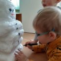 Kadangi lauke sniegas nekibo, sugalvojome jį pastatyti grupėje! Prisipylę į maišelius sniego ir parsinešę į grupę, juo užrišome, paminkėme, suplokštenome ir uždėjome vienas ant kito. Tarėsi, kas gali būti taip pastatytas iš tokių sniego plytų, o ką galėtų nupiešti. O kas gali atsitikti su sniegu, nes grupėje šilta. Sugalvoję padaryti besmegenius nupiešėme akis, nosį, burną ir sagas, uždėjome kepurę ir įdavėme šluotą. Džiaugiamės Senio Besmegenio grožiu ir jį stebėjome visą dieną. Vakarop nukrito kepurė, paskui galva, iškrito šluota… Maišeliuose liko vanduo… Su vaikais aptarėme, kodėl taip atsitiko ir prisiminėme, ką galvojome, kad gali nutikti.