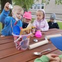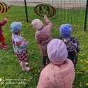 Išbandėme galimybes artimiausioje gamtoje sukurti ir pajausti garsų įvairovę. Vaikai kūrė ir bandė išgirsti įvairių buities reikmenų, medžio šakelių, pagaliukų, konkorėžių ir kitų įvairių gamtinių medžiagų dundėjimą, skambėjimą, šnaresį, stuksėjimą…Gėrėjomės gamtos garsų išgavimo galimybėmis. Tiesiog kūrėme gamtos muziką.