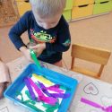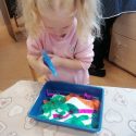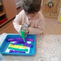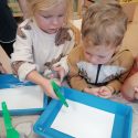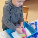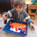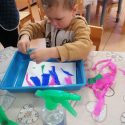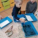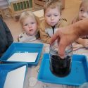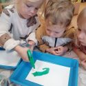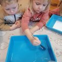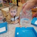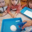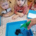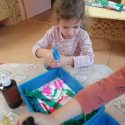 3 metų „Smalsučių“ gr. ugdytiniai tikrino kas vyksta, kai vanduo sušlapina įvairias medžiagas. Sušlapus žemei – ji netirpsta ir susidaro purvas, sušlapus cukrui – jis ištirpsta ir pasidaro cukraus tirpalas. Tokiu būdu vaikai susipažino su sąvokomis tirpus ir netirpus vandenyje. O kas nutinka, kai sušlampa spalvotas krepinis popierius? Tai jau smagioji dalis, suteikusi daug teigiamų emocijų ir fizinių galių išbandymo.