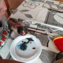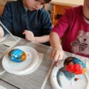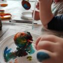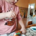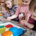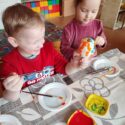 Vaikai tyrinėjo putplasčio kiaušinių formą, dydį, lygino, matavo. Atliko eksperimentą: sumaišė dažus su soda ir margino kiaušinius. Po to, pipetėmis lašino acto ir stebėjo vykstančią cheminę reakciją: burbuliukus, šnypštimą, garavimą. Vaikai vardino kas vyksta, ką užuodžia, kai kurie bandė palaižyti pirštuką, sakė „neskanu“.