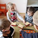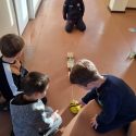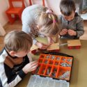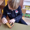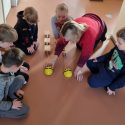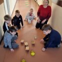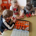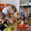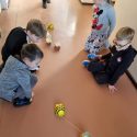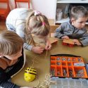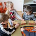 Atidžiai konstruoja vežimėlius pagal pateiktus surinkimo kortelių paveikslėlius. Pasirenka tinkamus raudonus skriemulius iš rinkinio, kurie bus vežimėlių ratai. Konstruoja juos prie vežimėlių. Naudodami virvutes ir turėdami lanksčiąją vilktį, sujungia vežimėlius ir 2 išmaniąsias bitutes. Krovinių(plastmasinių indų su vandeniu) gabenimo vietą pasirenka centro koridorių.