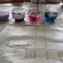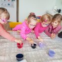 Tyrinėja violetinio kopūsto dažų savybes: pilant kopūsto nuovirą į paprastą vandenį, sodos tirpalą, acto tirpalą ir pieną, sužino, kad kopūstas turi dažančių savybių, kurios neutralius tirpalus nudažo violetine spalva, rūgščius tirpalus – raudona spalva, šarminius- mėlyna spalva. Merkia balto porpieriaus justeles į tirpalus, stebi, kokia spalva nusidažo juostelės.