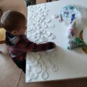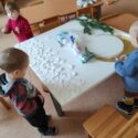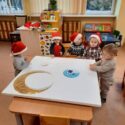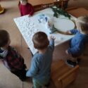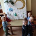 „Pagrandukai“ labai smalsūs ir darbštūs mažieji. Noriai priima pasiūlymą veikti, atnešti, padėti, bėgti, tyrinėti. Kūrybinės veiklos metu vaikai: liečia, klijuoja, bando dalyvauti, reaguoja į siūlymus, ima, uždeda, džiaugiasi, sukaupia dėmesį. Mes-tyrinėtojai! Vaikų kūrybinės veiklos indėlis metu svarus ir svarbus. Tyrinėjo vatos tampono sudėtį-jis dalinasi, lengvas, baltas, šiltas, lengvai klijuojamas. Susipažino su nauja medžiaga „putplasčiu“, jis lengvas, limpa, byra. Kam patiko draugystė, o kai kurie supyko, kad įkyriai laikosi prikibę. Mėnulio spalva- geltona, bandėm ištarti. Geltona spalva „kalba“, kai glamžome rankomis, garsas malonus, švelnus ir sako; lllm, mmmn, blmmm… Eglutes suskaičiavome: vienas, du. Išskyrėme ir parodėme: didelės ( kėlėme rankas į viršų) ir mažos (atsitupiame) eglutės. Žingsnis po žingsnio, visi kartu sukūrėme žiemos paveikslą ir juo kasdien džiaugiamės.
